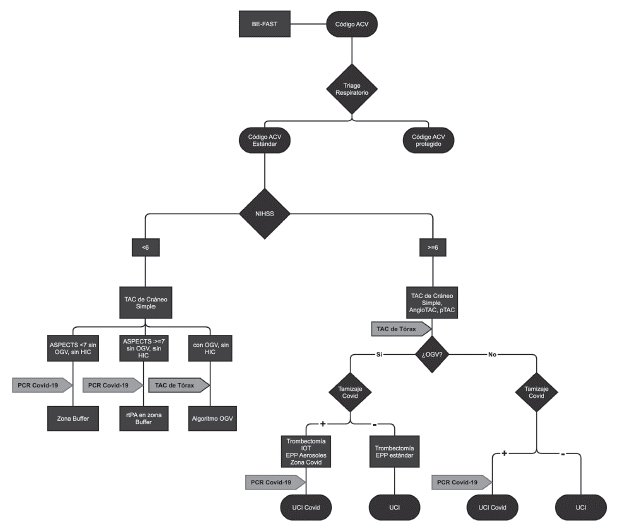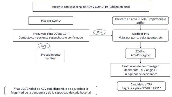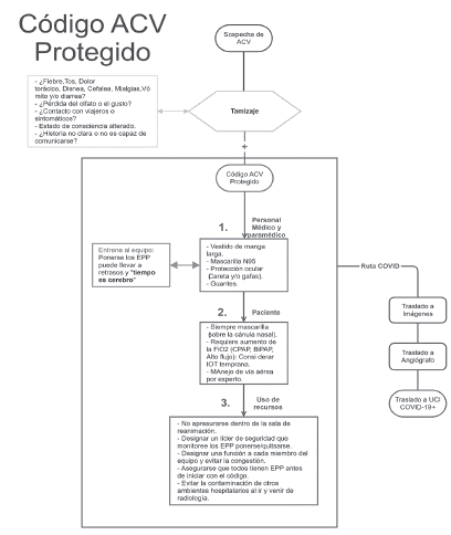 Buscamos presentar unas recomendaciones basadas en la experiencia de países con mayor tiempo de evolución de la pandemia, tratando de clasificar mejor los pacientes, ajustar el uso de material de protección personal a la contingencia y a una posible menor disponibilidad a futuro. Aumentar los elementos en el algoritmo de cuidado en beneficio de nuestro personal de salud. Brindar algoritmos prácticos para el tratamiento de una patología tiempo dependiente, en el marco de una pandemia donde la información está en construcción y es limitada. Se propone en las figuras 1 y 2 los algoritmos del código ACV protegido. Esta es una primera versión de las recomendaciones de expertos del comité de enfermedad cerebrovascular de la ACN que periódicamente se irá actualizando según la evolución de la pandemia en nuestro país.