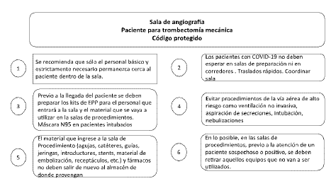 Dentro de las recomendaciones principales está el cuestionario de tamizaje al ingreso a urgencias, uso de tapabocas para el paciente, considerar todo Código ACV sospechoso de covid-19, toma de PCR para covid-19 en todos los ACV y llevar a zona buffer. En sospecha de oclusión proximal incluir tomo-grafía de tórax a la evaluación de imágenes.