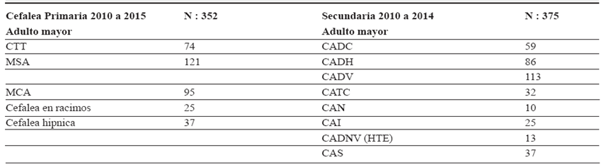 Were incluyed 727 patients, the average age was 72.4 years, with a predominance of headache in women (70, 4%); 352 (48.42%) met criteria for primary headache (PC) and 375 (51.58%) for secondary headache (CS).