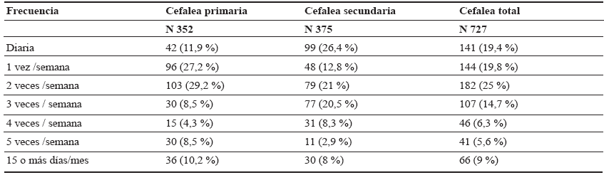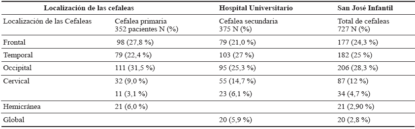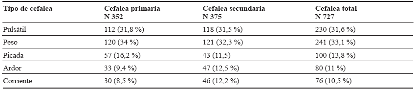 Se encontró que la localización más usual fue en la región occipital 206 (28,3 %), seguida de la temporal 182 (25 %) y frontal 177 (24,3 %) (tabla 2). El dolor más frecuente fue el de tipo peso en el 33,1 % y pulsátil en el 31,6 % para las cefaleas primarias, seguido del dolor de tipo picada, ardor y corrientazo, especialmente en cefaleas secundarias (tabla 3).