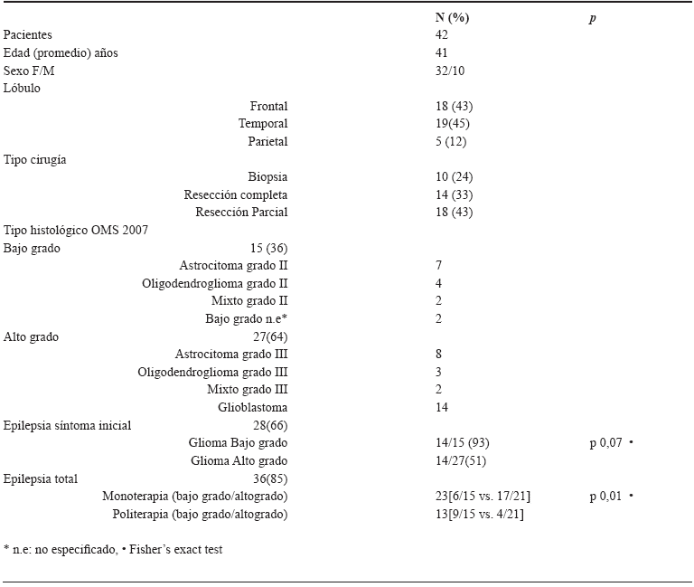 Se incluyeron 42 pacientes (edad promedio 41 años, rango 15-71) incluyendo 15 gliomas grado II (7 astrocitoma, 4 oligodendroglioma, 2 gliomas mixtos, 2 gliomas no especificados) y 27 gliomas de alto grado (14 glioblastoma, 8 astrocitoma III, 3 oligodendroglioma, 2 gliomas mixtos). Durante la evolución de la enfermedad 36 (85 %) pacientes presentaron epilepsia sintomática. Las convulsiones fueron la manifestación clínica inicial en 28 (66 %) de casos siendo significativamente más frecuente en gliomas de bajo grado (93 % bajo grado vs. 51 % alto grado, p=0,07). El uso de monoterapia anticonvulsivante fue reportada en 23 casos (63 %). En el grupo de gliomas de bajo grado, solo 40 % respondieron a terapia con 1 solo medicamento, requiriendo politerapia más frecuentemente que los gliomas de alto grado (9 de 15 bajo grado vs. 4 de 21 alto grado, p=0,01) mientras que en gliomas de alto grado fue tratada con monoterapia en 80 %.