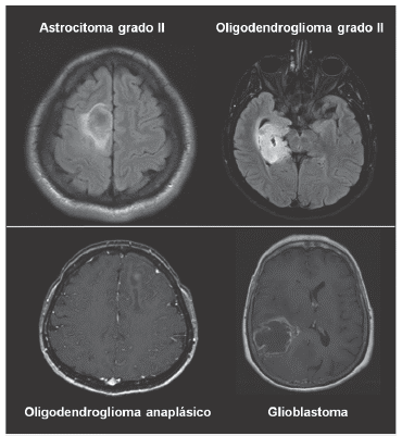 Figura 1: Imagénes de resonancia magnética cerebral de casos ilustrativos de diferentes tipos de gliomas cerebrales. Panel superior: secuencias T2-Flair ilustrando el aspecto radiológico de gliomas difusos de bajo grado. Panel inferior secuencias T1-gadolinio de pacientes con gliomas de alto grado.