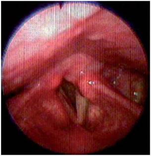 Figura 8: Nasofibrolaringoscopia, glotis abierta con ubicación de cuerda vocal izquierda en línea media.