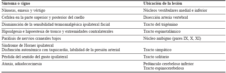La manifestación clínica es variada dentro de un espectro de hallazgos clínicos que se determinan según la extensión del infarto bulbar (tabla 1); entre los principales síntomas están las náuseas y emesis 88 %, ataxia 88 %, síndrome de Horner 88 %, nistagmo 71 %, emesis 65 %, disfagia 62 %, disfonía 41 % 5.