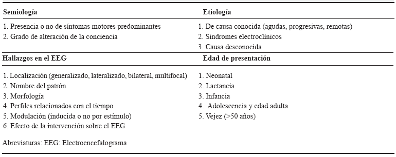 El EE se clasificaba de acuerdo a la edad de presentación, etiología, tipo de la crisis y localización de la lesión. La ILAE ha sugerido que se empleen cuatro ejes en la clasificación del EE: semiología, etiología, hallazgos electroencefalográficos y edad de presentación (tabla 1) 4.
