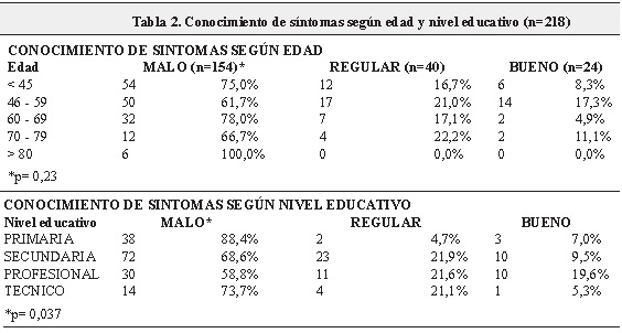 Cuando se comparó el conocimiento de síntomas según el nivel educativo, el calificado como “malo” se presentó en mayor proporción en aquellos con estudios de primaria (88,4%), pero también en más de la mitad de quienes reportaron estudios técnicos y profesionales (73,7% y 58,8%, respectivamente), aunque con diferencias estadísticamente significativas (p=0,037). (Tabla 2)