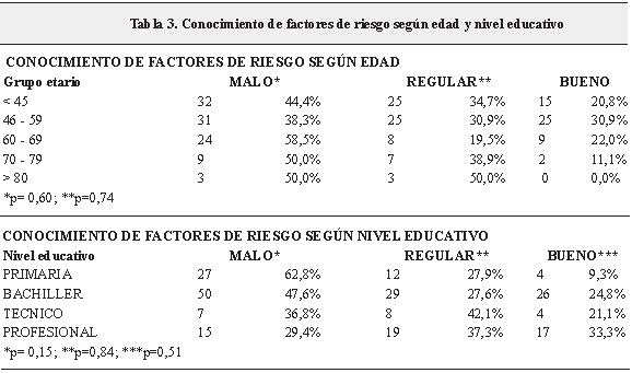 Un 45,4% (n=99) de la muestra no conocía ningún FR (conocimiento “malo”), 31,2% (n= 68) conocía uno (“regular”) y 23,4% (n= 51) conocía dos o más (“bueno”). El grupo de 60 a 69 años mostró los peores resultados con 58,5% de conocimiento “malo”, mientras que el grupo de 46 a 59 años obtuvo los mejores resultados con 38,3% (p>0,05). (Tabla 3) Con respecto al nivel educativo, el conocimiento “malo” de FR mostró diferencias porcentuales en el nivel de primaria, aunque no alcanzó significancia estadística (p=0,15) (Tabla 3). De los sujetos que mencionaron algún FR, la HTA fue el más citado en un 65% de los casos, seguido de dislipidemia y tabaquismo, mientras que la diabetes mellitus fue el menos recordado con un 20% de los casos.