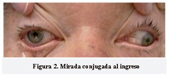 Hombre de 57 años, sin discapacidad neurológica previa, con antecedente de hipertensión arterial crónica y diabetes mellitus tipo 2, quien presentó un cuadro de 30 horas de evolución consistente en cefalea global e hipoacusia de inicio súbito, acompañada por temblor generalizado, ataxia, vértigo y múltiples episodios eméticos; posteriormente comenzó a presentar hemiparesia e hipoestesia izquierdas. Al examen físico el paciente se encontraba somnoliento, orientado, con incapacidad para la movilización horizontal del ojo derecho y ausencia de aducción del ojo izquierdo (Figura 2), paresia facial central izquierda leve, y presentaba una respuesta plantar neutra izquierda; el puntaje en la escala de severidad de NIHSS fue de 14/42. Se realizó una tomografía cerebral simple, la cual fue normal, no cumplió los criterios de inclusión para trombólisis cerebral intravenosa por tener una ventana de tiempo mayor de 4,5 horas, por lo que se decidió realizar manejo médico con ácido acetilsalicílico y atorvastatina orales.