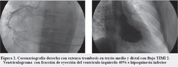 El paciente es llevado a coronariografía (Figura 2), encontrando arteria descendente anterior y arteria circunfleja sin lesiones y coronaria derecha con extensa trombosis en tercio medio y distal con flujo TIMI 3. Fracción de eyección del ventrículo izquierdo 40% con hipoquinesia inferior.