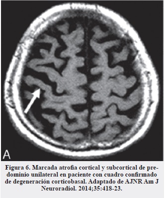 En el diagnóstico diferencial con degeneración corticobasal es importante buscar la atrofia cortical marcada unilateral característica de esta entidad (Figura 6) (17, 19) y de las afasias primarias progresivas y ausentes en la PSP, en las que la atrofia es más generalizada (17).