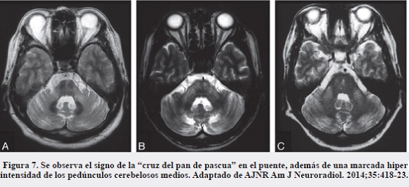 También se encuentran alteraciones mediante imágenes en pacientes con atrofia múltiple sistémica, en la que típicamente se denota aumento de la intensidad de la señal del putamen y, a la altura del puente, una imagen en cruz en los cortes axiales en T2, representativa de la degeneración selectiva de los tractos pontocerebelosos, hallazgo conocido como signo de "la cruz del pan de pascua" (Figura 7), el cual también ha sido descrito en otras entidades como atrofia espinocerebelosa tipo 2 y 3, parkinsonismo vascular y enfermedad de Creutzfeldt-Jakob (16, 17).