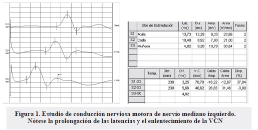- Respuestas motoras de mediano derecho con parámetros dentro de límites normales. Respuestas izquierdas con latencias prolongadas de forma moderada a expensas de la latencia distal (a nivel del carpo), enlentecimiento de la velocidad de conducción nerviosa (VCN) en el tramo codo-carpo, resto de los parámetros dentro de límites normales (Figura 1).