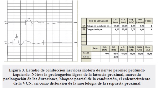- Respuestas motoras de peroneo profundo derecho con latencia proximal prolongada, morfología proximal abigarrada, VCN enlentecida y resto de los parámetros dentro de límites normales. Respuestas izquierdas con latencia proximal prolongada, morfología proximal abigarrada, duraciones prolongadas, VCN enlentecida, aumento del porcentaje de caída de amplitud y área en el segmento cabeza del peroné-garganta del pie con dispersión temporal normal (bloqueo parcial de la conducción), resto de los parámetros dentro de límites normales (Figura 3).