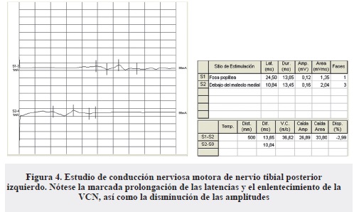 - Respuestas motoras de ambos nervios tibiales posteriores con latencias marcadamente prolongadas a expensas de la proximal, morfología anormal, duraciones prolongadas, VCN enlentecida y amplitudes disminuidas (Figura 4).
