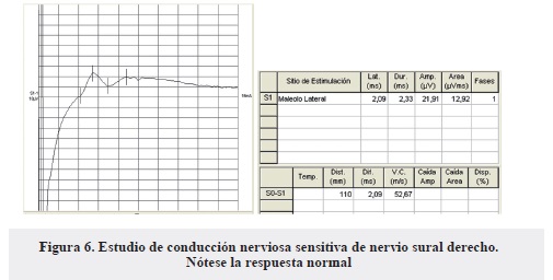 - Respuestas sensitivas de ambos nervios surales con parámetros dentro de límites normales (Figura 6).