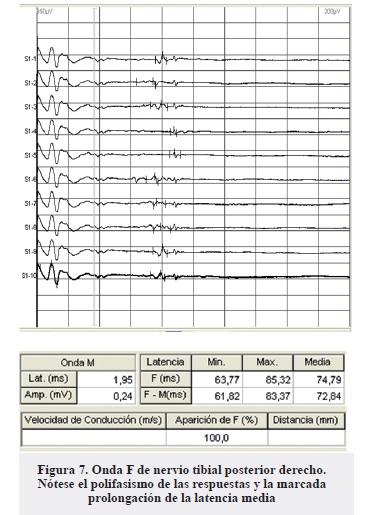 - Respuestas de ambos tibiales posteriores con latencia media marcadamente prolongada, morfología abigarrada, porcentaje de aparición normal (Figura 7).