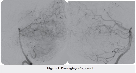 En la Figura 1 se presentan los resultados de la panangiografía realizada al paciente del caso 1, en la que se observa en la fase arterial oclusión del segmento cerebral medio proximal derecho, redes vasculares anormales rete mirabilis en ambos segmento cerebrales medio y ganglios basales predominante en el derecho, disminución del calibre de la arteria cerebral media izquierda, conclusión de oclusión del segmento derecho con patrón de moyamoya.