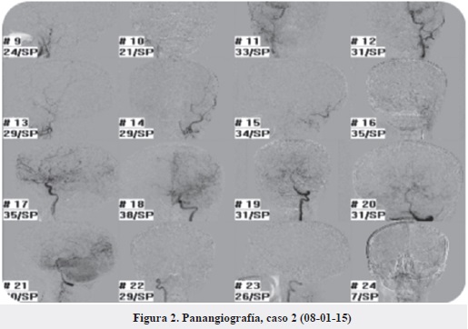 En el caso 2, el paciente masculino de 46 años de edad, sin antecedentes aparentes, consultó por cuadro de quince días de evolución de cefalea que se asocia a pérdida de conciencia con posterior desorientación y lenguaje incoherente. Tras estudio topográfico cerebral extrainstitucional se evidencia ocupación por material hiperdenso hemático de sistema ventricular a nivel de los ventrículos laterales, III y IV ventrículo, ocupación por material hiperdenso hemático en los cuernos temporalis de ventrículos laterales, valorado por neurocirugía; debido a no disponibilidad de angiotomografía ni panangiografía institucional, solicitan RMN cerebral más angiorresonancia. Se diagnostica hemorragia intraventricular de etiología a estudio. Posterior a estos estudios, neurocirugía determina ordenar panangiografía cerebral con conclusión de patrón de moyamoya bilateral compatible con enfermedad de moyamoya tipo I.