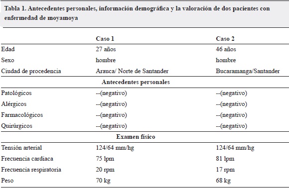 En las Tablas 1 y 2 se presenta la información correspondiente a datos demográficos (edad de consulta, sexo, ciudad de procedencia), antecedentes personales, y la valoración de los dos casos reportados con moyamoya.