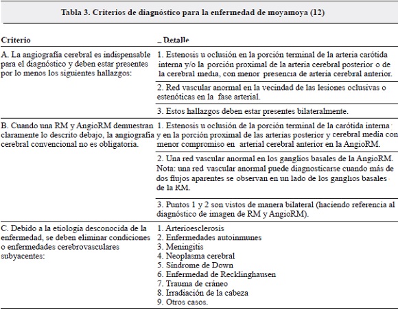 La enfermedad de moyamoya se diagnostica siguiendo los criterios establecidos por el Comité de Obstrucción Espontánea del Círculo de Willis, del Ministerio de Salud japonés (Tabla 3). Dichos criterios se apoyan en el análisis de estudios de neuroimagen como angiografía, angiorresonancia, tomografía computada por emisión de fotón único (SPECT), tomografía por emisión de positrones (PET), resonancia magnética de perfusión, dúplex y doppler transcra¬neal (DTC) (12). Para los estudios de caso presentados, el diagnóstico se realizó con análisis de TAC cerebral simple y Angio-TAC para el caso 1, y de tomografía cerebral para el caso 2 (Figura 3).