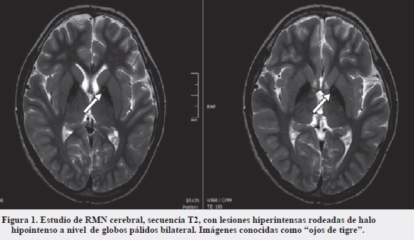 Al examen se evidenciaron movimientos distónicos generalizados e hiperreflexia musculotendinosa, trastorno del habla y déficit cognitivo. Se iniciaron estudios. Los ácidos orgánicos urinarios cualitativos, el perfil de acilcarnitinas y la relación ácido láctico/piruvato fueron normales; el estudio para Nieman Pick tipo C también fue negativo, la resonancia magnética cerebral inicial normal y el estudio molecular para atrofia espinocerebelosa fue negativo. El paciente presenta progresión de las distonías, con presencia de tormenta distónica en dos ocasiones. Se realizó manejo con múltiples fármacos, incluida bomba de baclofeno, sin mejoría. Se realiza resonancia magnética cerebral de tres teslas con cortes finos de ganglios basales, informándose hiperintensidad de globos pálidos bilateral, con halo de hipointensidad, imagen conocida como "ojos de tigre" que sugiere depósito de hierro (Figura 1).
