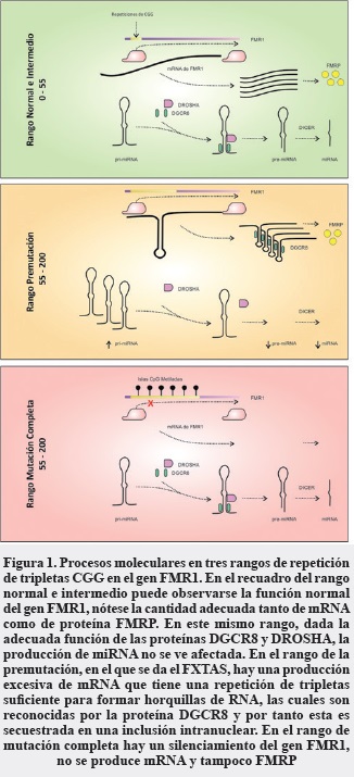A diferencia de lo que ocurre en la mayoría de los pacientes con la mutación completa, es decir, con el síndrome de cromosoma X frágil, y en quienes tienen el gen FMR1 completamente metilado ("silenciado"), lo que conduce a un expresión mínima o inexistente del mRNA y un subsecuente déficit de la proteína del FMR1 (FMRP) (8), se ha visto que los pacientes con FXTAS tienen sobreexpresión del gen, lo cual lleva a una aparente toxicidad por exceso de su mRNA (Figura 1). Sin embargo, también se han descrito algunos casos del síndrome en portadores dentro de la zona gris (45-54 repeticiones de CGG) (9, 10) y en individuos con la mutación completa (> 200 repeticiones de CGG) que tienen el gen parcial o completamente desmetilado ("activo") (11, 12).