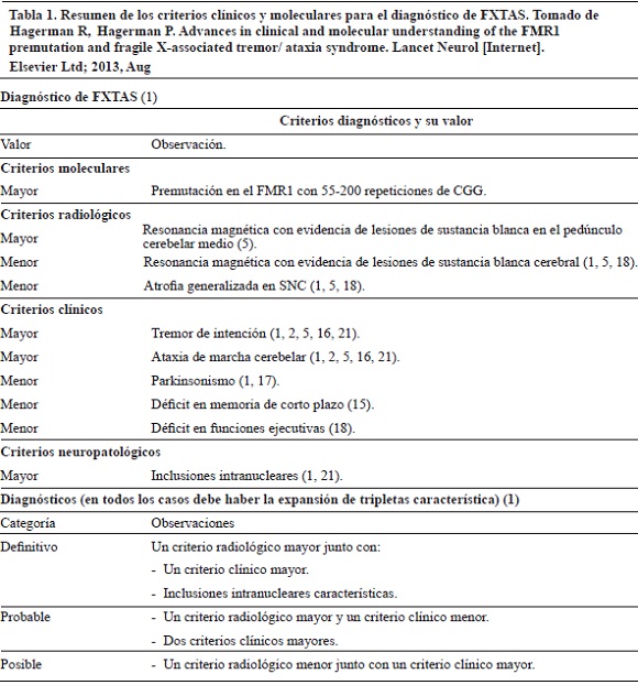 Según Hagerman et al. (1, 21), para un diagnóstico definitivo de FXTAS (Tabla 1) se necesita la presencia de un criterio clínico y radiológico mayor, o un criterio radiológico mayor y la presencia de inclusiones intranucleares redondeadas típicas de FXTAS en neuronas y astrocitos (1, 21). Estas inclusiones tienen una distribución amplia a través de todo el cerebro y el tallo cerebral (1, 17, 21). En el caso de un diagnóstico probable, se debe presentar un criterio radiológico mayor acompañado de un criterio clínico menor, o por el contrario, dos criterios clínicos mayores, es decir, la presentación conjunta de temblor de intención y ataxia cerebelar que característicamente se pueden identificar en estos pacientes al examen clínico. Por último, un diagnóstico posible de FXTAS se constituye a partir de la presencia de un criterio radiológico menor y un criterio clínico mayor (1, 16). De manera que el diagnóstico de este síndrome se hace mucho más complicado que la observación de temblor y ataxia en pacientes con la premutación del gen FMR1 identificada (1, 2, 4).