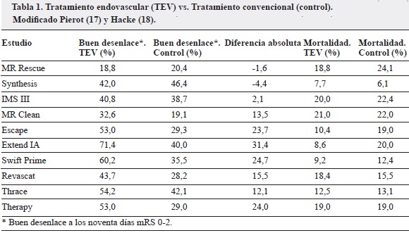 El año 2015 ha traído los resultados positivos de siete estudios que describen las ventajas del tratamiento endovascular (TEV) en los pacientes con ataque cerebrovascular (ACV) isquémico agudo por obstrucción arterial proximal sobre el tratamiento convencional con trombólisis sistémica o intravenosa (IV) en un plazo inferior a las 4,5 horas (1-7).