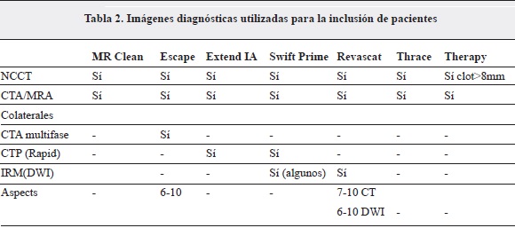 La diferencia fundamental entre los estudios publicados en el 2013 (MR Rescue, Synthesis E IMS III) y los del 2015 (MR CLEAN, ESCAPE, EXTEND IA, SWIFT PRIME, REVASCAT, THRACE and THERAPY) es la inclusión en estos últimos únicamente de pacientes con obstrucción proximal de la circulación anterior, aunque en el THRACE se incluyeron también las del sistema vertebrobasilar, demostradas en la angiografía por TAC cerebral (CTA), angiorresonancia (MRA) o angiografía por sustracción digital (DSA).