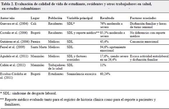En Colombia algunos estudios publicados han evaluado la calidad de vida de estudiantes, residentes y otros profesionales de la salud con diversos resultados y factores asociados, usando como medida el SDL y en uno de ellos la somnolencia diurna (Tabla 2). Sin embargo, muchos otros quedan confinados en la literatura gris, lo cual representa un obstáculo para el conocimiento objetivo del estado actual del bienestar de los residentes en Colombia.