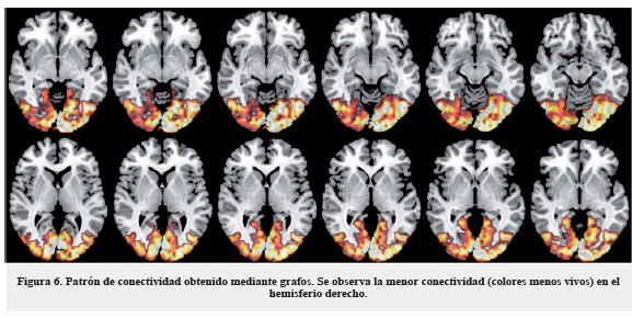 Dado que los cambios de conectividad entre hemisferios se pueden deber a características propias del algoritmo ICA utilizado, no a alteraciones en la actividad neuronal ocasionadas por la epilepsia, se aplicó un segundo esquema de procesamiento de conectividad utilizando un enfoque de teoría de grafos implementado en otro caso de epilepsia (25). El análisis de grafos (Figura 6) se realizó sobre el lóbulo occipital y permite evidenciar una pérdida de conectividad en el hemisferio derecho en la misma zona detectada por el PET como de bajo consumo de glucosa.