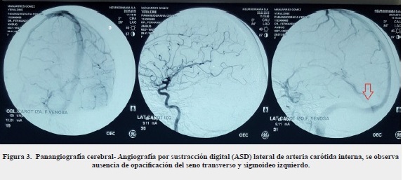 La paciente fue referida a la Fundación Centro Colombiano de Epilepsia y Enfermedades Neurológicas-FIRE por presentar cefalea occipital pulsátil de intensidad moderada de un mes de evolución asociado con náuseas, emesis, fotofobia, sonofobia, sin antecedentes de trauma craneoencefálico, ni enfermedades autoinmunes, sin historia de amenorrea, tampoco de abortos (G 0 P0 A0). A la evaluación física se observó en regular estado músculo nutricional, con signos vitales en metas FC: 82 latidos por minuto, FR: 18 respiraciones por minuto, normotensa con una presión arterial de 110/60 mm Hg, temperatura: 36,5 grados centígrados, peso 46 kg. El examen neurológico es normal sin presencia de signos patológicos. Como diagnóstico inicial se consideró el diagnóstico cefalea con signos de alarma. Se le ordenó una resonancia magnética cerebral (RM) 1,5 tesla que mostró una trombosis aguda del seno transverso y sigmoideo izquierdo (figura 1,2) punción lumbar con presión de apertura elevada. La prueba de embarazo fue negativa, hemograma con anemia leve, normocítica, normocrómicas, leucocitosis 16.490 mm3, sin trombocitos, nitrógeno ureico, creatinina, glucemia, tiempos de coagulación, proteinograma normales. Se inició anticoagulación con enoxaparina, previamente se realizaron paraclínicos de extensión para determinar causa de trombosis venosa cerebral, reportando proteína S por ELISA disminuida; factor V de Leiden, proteína C, antitrombina III y factor VIII normal, siklemia negativa, anticoagulante lúpico negativo, anticardiolipinas IgG e IgM negativa, anticuerpos antinucleares negativos; panangiografía cerebral comprueba trombosis del seno transverso y sigmoideo izquierdo (figura 3). Posterior al tratamiento, la paciente inició mejoría gradual a su estado, a los 14 días de estancia hospitalaria fue enviada a su casa con anticoagulación ambulatoria con enoxaparina subcutánea por 2 semanas y luego manejo con anticoagulación oral.