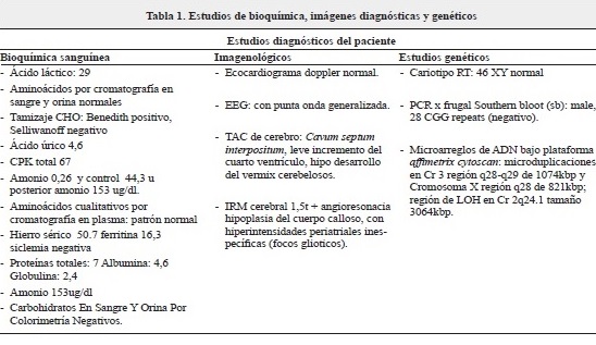 Paciente masculino de 9 años, con diagnóstico de epilepsia generalizada de inicio a los 5 años, refractaria a manejo farmacológico, con parálisis cerebral espástica y retraso neuromadurativo global. Antecedentes personales de infecciones respiratorias recurrentes, requirió hospitalización y manejo. Al examen físico con medidas antropométricas: talla 138 cm - peso 24 kg - PC 53 M - IMC 13 kg/M2. Fenotipo (figura 1) con paladar ojival, mallampathy III, implantación auricular baja, pabellón auricular proyectado hacia adelante, implantación baja del cabello, hipoplasia malar bilateral, escapulas aladas, genu varo, pie plano. Se realizaron paraclínicos (tabla 1) y resonancia magnética nuclear 1.5 tesla (figura 2), en la que se reporta hipoplasia del cuerpo calloso, hipodesarrollo del vermis cerebeloso.