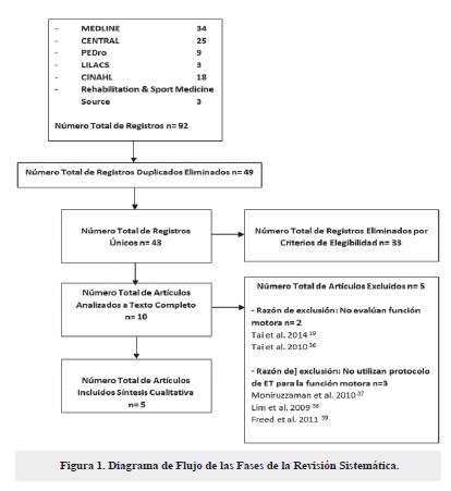 Para la realización de la presente RS se desarrolló una estrategia de búsqueda en la cual se incluyeron los siguientes criterios de elegibilidad: 1) ECAs; 2) En pacientes mayores de 18 años con diagnóstico de ACV en la fase aguda, sub aguda o crónica, sin distinción de genero y raza; 3) La intervención estudiada debe ser algún protocolo de ET adicionado a un tratamiento de rehabilitación física convencional; 4) Artículos publicados en inglés o español hasta el 31 de agosto del 2016.