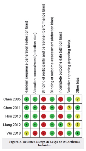 La evaluación del riesgo de sesgo realizado por los autores de la presente revisión se presenta en las figura 2 y 3. Cabe consignar que la mayoría de los estudios seleccionados reportaban la forma como se había realizado la aleatoriza-ción y el ocultamiento de la asignación, sin embargo el ECA de Wu et al.34, presentaba alto riesgo de sesgo ya que fue el único que no menciona como fue realizada la aleatorización y como se ocultó la asignación, debido a la naturaleza de las intervenciones terapéuticas estudiadas ninguno de los ECAs presentaba cegamiento de los pacientes y de los FT tratantes, teniendo alto riesgo de sesgo, por el contrario todos presentaban cegamiento de los evaluadores. Si bien es cierto, la mayoría de los estudios presentan pérdidas de pacientes durante el tiempo de tratamiento y/o seguimiento, solo el ECA de Liang et al.32, tiene un bajo sesgo de desgaste ya que contempló dentro de su diseño metodológico un análisis estadístico por intención de tratar.