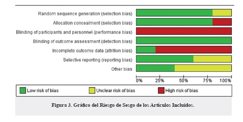 El riesgo de sesgo se evaluará utilizando la herramienta propuesta en el Handbook de la Cochrane30. Cada estudio será evaluado cualitativamente y los resultados serán presentados en una tabla especificando si cumple el criterio, será representado con el color verde (bajo riesgo de sesgo), si no lo cumple con color rojo (alto riesgo de sesgo) y no claro con color amarillo (falta de información o incertidumbre sobre la potencial presencia de sesgo). Los 7 criterios a evaluar son; generación de la secuencia de aleatorización, ocultamiento de la secuencia de aleatorización, cegamiento de participantes y personal, cegamiento de evaluadores, manejo adecuado de las pérdidas (análisis por intención de tratar), reporte selectivo de medidas de resultado, otros sesgos.