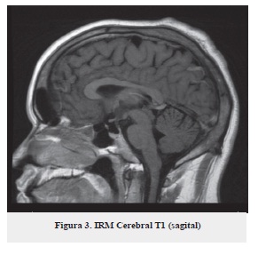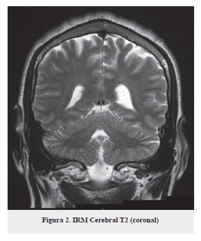 Se plantea como impresión diagnóstica: síndrome cerebeloso en estudio, por tal motivo se ordena resonancia magnética simple y con gadolinio (figuras 1, 2 y 3) no se observan lesiones ocupantes de espacio intra o extra axiales, no hay alteraciones de señal en el parénquima cerebral, cerebro medio o fosa posterior, no hay alteración en el cerebelo.