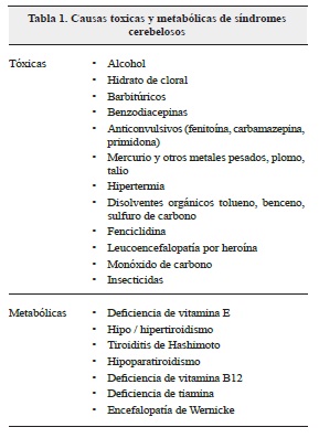 El paciente de acuerdo a las manifestaciones clínicas, cursaba con un síndrome pancerebeloso, dado el aumento del polígono de sustentación, ataxia de la marcha hipotonía, disartria escandida, nistagmus, dismetría y adiadococinesia derecha; a pesar de que predominaban los signos cerebelosos hemisféricos también tenía compromisos del lóbulo floculonodular (nistagmus) y compromiso vermiano (marcha atáxica)1-4,6-10. Neuroimágenes por resonancia magnética para descartar lesiones de la fosa posterior causante de síndrome cerebeloso: enfermedades autoinmunes, inflamatorias, vasculares, infecciones, tumores primarios y secundarios, traumas, iatrogénicos, ataxias hereditarias, esporádicas5,11-16. La imagen por resonancia magnética normal y la persistencia de la sintomatología cerebelosa nos debe hacer pensar en la posibilidad de factores tóxicos o metabólicos desencadenantes de las manifestaciones clínicas, entre las causas más comunes (tabla 15,17,18) .