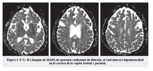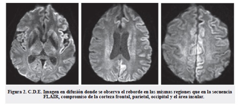 La paciente llevó las pruebas neuropsicológicas extrainstitucionales realizadas en enero de 2015, que mostraron deterioro cognitivo de posible etiología vascular, con funcionamiento cognoscitivo disminuido, afasia semántica, compromiso de memoria verbal explícita y dificultades de tipo atencional a nivel ejecutivo. Se consideró, por tanto, que la paciente cursó con un cuadro de demencia rápidamente progresiva y se inició estudio intrahospitalario mediante punción lumbar con presión de apertura normal y citoquímico sin evidencia ningún hallazgo patológico; TAC de abdomen y de tórax sin alteraciones; electroencefalograma que mostró anomalías dadas por ondas lentas que tienden a tomar un patrón pseudoperiódico de predominio en región frontotemporal derecha; y el RM simple y con gadolinio evidenció restricción de la difusión que compromete la corteza cerebral de los lóbulos frontales, parietales, occipitales y temporales de manera bilateral y simétrica.