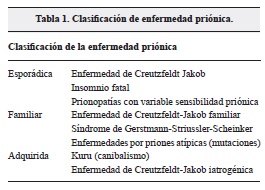 Existen tres formas de enfermedades priónicas: hereditaria, adquirida o esporádica. Esta última, de acuerdo a sus características clínicas y patológicas, se divide en Creutzfeld Jakob (ECJ), insomnio familiar fatal y el Kuru2 (tabla 1).