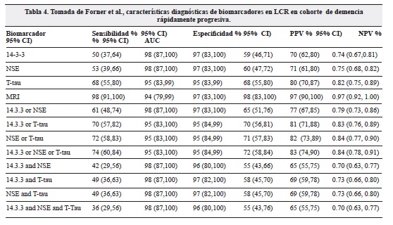 Recientemente Forner et, dada la pobre sensibilidad y especificidad de CSF 14-3-3 para la Enfermedad de Creutzfeldt-Jakob esporádica (sCJD) en la evaluación de los pacientes con demencia rápidamente progresiva (RPD) y la discordancia entre los diferentes marcadores de LCR utilizados para el diagnostico de esta entidad, realizaron una evaluación donde compararon 14-3-3, ESN, y T-tau en una cohorte de pacientes remitidos a la Universidad de California en San Francisco (UCSF) y el Centro de Memoria y Envejecimiento entre el 2005 y el 2012, en la tabla 4 se muestran los resultados obtenidos.