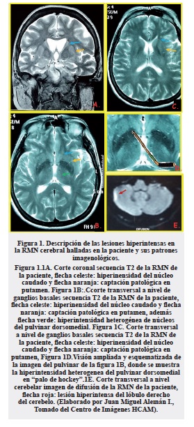 En el análisis imagenológico del caso se apreciaron hiperintensidades heterogéneas simétricas a nivel del ribete cortical, además en el núcleo caudado, en el putamen y en los pulvines; de esta manera se correlaciona con el fenotipo imagenológico de MM1, conocida como forma clásica.