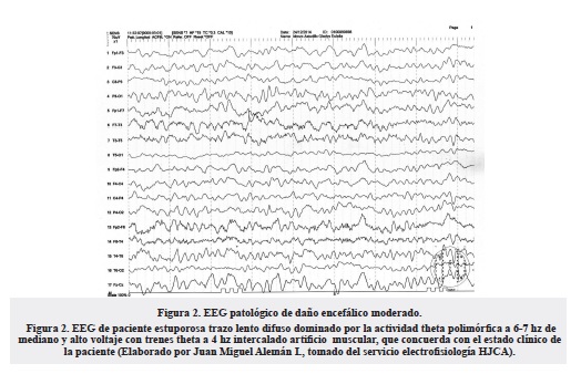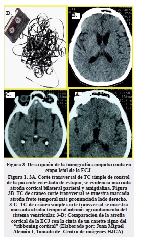 En los siguientes dos meses el deterioro cognitivo fue progresivamente rápido, llegando al estupor, se realizó un electroencefalograma (EEG) que mostró un trazo lento difuso dominado por actividad theta polimórfica a 6-7 hz de mediano y alto voltaje con trenes theta a 4 hz intercalado artificio muscular con trazo lento difuso (figura 2). Producto de su condición contrajo una neumonía adquirida en la comunidad (NAC); esto debilitó aún más la condición, solo mostrando respuesta a estímulos dolorosos, se realizó TC de control con atrofia cortical en forma de cinta “ribboning cortical” que hace cuatro meses no estaba pronunciada (figura 3); después de cinco días con antibiótico-terapia de amplio espectro, la paciente falleció con un rápido deterioro cognitivo, se realizaron estudios patológicos post mortém de tejido cerebral donde se observó amplia atrofia cortical y subcortical.