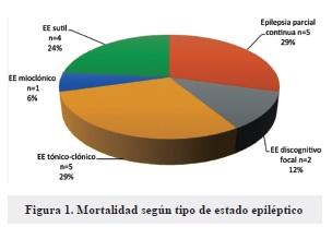 La tasa de mortalidad encontrada (20,2%) corresponde a la reportada en la literatura (5, 11, 12). La etiología estructural (ataque cerebrovascular o tumor cerebral) fue la más frecuente en los pacientes con desenlace de muerte, lo que corresponde con la conclusión de la revisión sistemática por Chin y co (7). En cuanto a la frecuencia de secuelas neurológicas en casos de EE no fatales, se considera que fue baja comparada con los datos reportados en la literatura, independientemente del uso de definiciones diferentes del EE en los estudios revisados (11, 13).