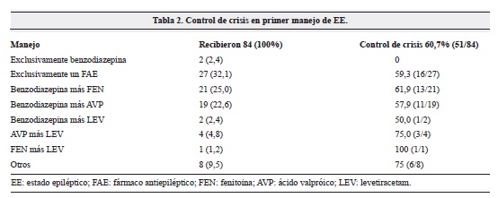 Como primera línea, 2 (2,4%) pacientes recibieron exclusivamente una benzodiazepina, 27 (32,1%) solo un anticonvulsivante diferente a benzodiazepina, y 42 (50,0%) recibieron combinaciones de benzodiazepinas con otro anticonvulsivante. Las combinaciones de los fármacos antiepilépticos más usadas fueron benzodiazepina más fenitoina o ácido valproico (25,0% y 22,6% respectivamente). De 27 pacientes que recibieron como primera línea exclusivamente un anticonvulsivante, se observó control de crisis en 16 (59,3%); los resultados de control de crisis según el tratamiento recibido se muestran en la tabla 2.