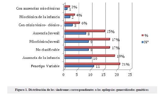 Durante el periodo de estudio, 5.357 pacientes fueron registrados en la institución donde fue llevada a cabo esta investigación, de ellos 53 pacientes (1%) presentaron diagnóstico de Epilepsia Generalizada Genética con una distribución heterogénea para cada síndrome (Figura 1), ocupando el primer lugar la epilepsia con fenotipo variable, representando el 21% de los casos, en posiciones intermedias, la epilepsia de ausencia infantil (19%) y mioclónica juvenil (17%) y por último la epilepsia con ausencias mioclónicas con tan solo el 2%.