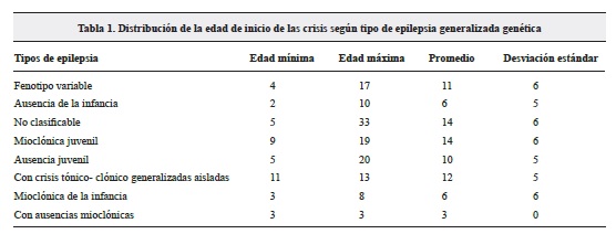 Se identificaron las edades promedio de inicio de crisis para cada síndrome, siendo la menor para la epilepsia de ausencia mioclónica a los 3 años y la mayor para la epilepsia mioclónica juvenil a los 19 años (Tabla 1).