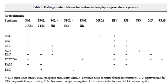 Aquellos síndromes que presentaron mayor heterogeneidad eléctrica interictal fueron la epilepsia con crisis tónico clónicas aisladas y la no clasificable. La epilepsia mioclónica juvenil y fenotipo variable presentaron varias similitudes, como se muestra en la Tabla 3.