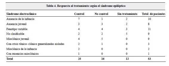 Según el tipo de síndrome epiléptico, en las ausencias infantiles se consiguió el control de crisis en el (n=10), 70% de los casos, un 20% no recibía tratamiento farmacológico y el 10% no lo obtuvo a pesar de la medicación. En la epilepsia de fenotipo variable (n=11) el 36% tuvo control de las crisis, 36% no se controlaron y un 27% no recibió tratamiento farmacológico. En la epilepsia mioclónica juvenil (n=9), el 44% consiguió un control de las crisis. Para el caso de la epilepsia de ausencias juveniles (n=8) se encontró 37.5% de control de las crisis, 37.5% no tuvieron control de las crisis y el 25% no recibían tratamiento farmacológico. La frecuencia del control de crisis en los restantes grupos de síndromes epilépticos se describe en la Tabla 4.
