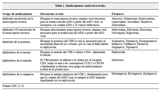 El desarrollo de las terapias antirretrovirales ha tenido un impacto significativo en las manifestaciones neurológicas en VIH/SIDA, un ejemplo es la encefalitis por VIH, usual en la era pre TARGA alcanzando hasta el 40%, actualmente con el advenimiento de antirretrovirales se ve en menor proporción (42, 43). Los antirretrovirales actúan en diferentes puntos de la interacción entre el VIH y la célula del huésped, aunque actualmente no existe cura para el VIH, la terapia altamente efectiva TARGA se basa en combinaciones de al menos tres antirretrovirales, precisamente para atacar en distintos puntos dicha interacción con el fin de lograr interferir la replicación viral y poder mantener unas cargas virales incluso en niveles indetectables (13, 43), hoy en día, hay 6 grupos de medicamentos usados en terapia antirretroviral (Tabla 1) aprobados por la FDA y desde 2014 se unió al arsenal terapéutico, el Cobicistat Tybost® aún no disponible en Colombia actúa como un potenciador de la farmacocinética de los antirretrovirales, inhibiendo la citocromo P450 para interferir el metabolismo e influye en las proteínas de trasporte para aumentar la disponibilidad (44).